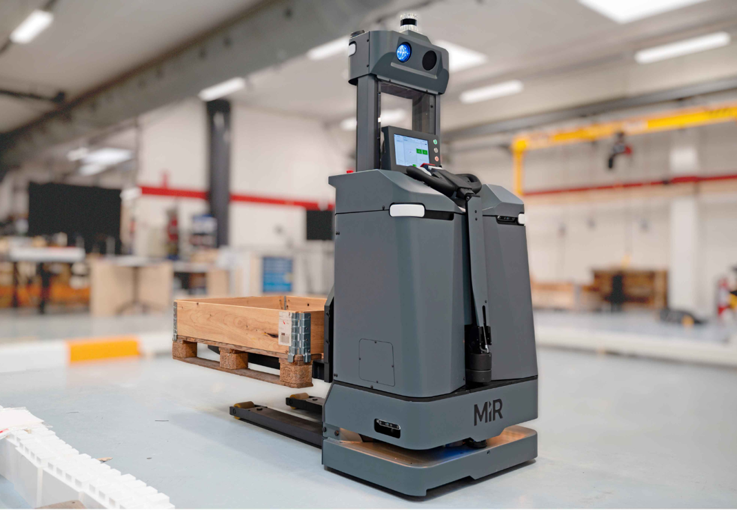 Med en nyttelast på 1200 kg er MiR1200 Pallet Jack en kraftfuld og fleksibel AMR til pallehåndtering.