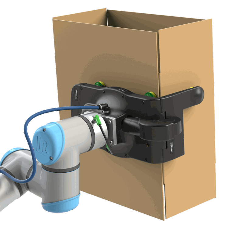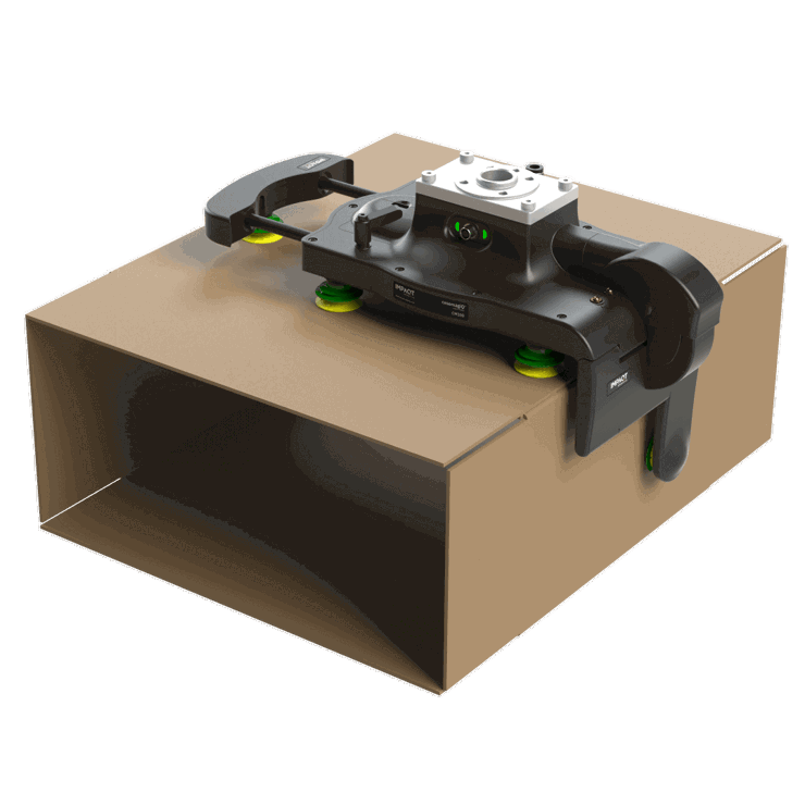 CM100 er en kompakt Universal Case Forming EOAT med en udvidelig arm, designet til problemfrit at rejse kasser i varierende dimensioner.