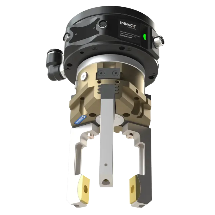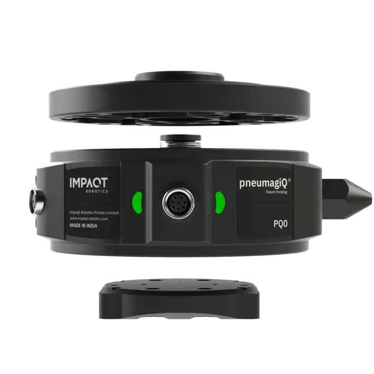 pneumagiQ PQ0 er et kompakt universelt pneumatisk EOAT-interface med en mekanisk formfaktor, der er designet til problemfrit at montere pneumatisk EOAT med en 0° forskydning fra robotflangen.