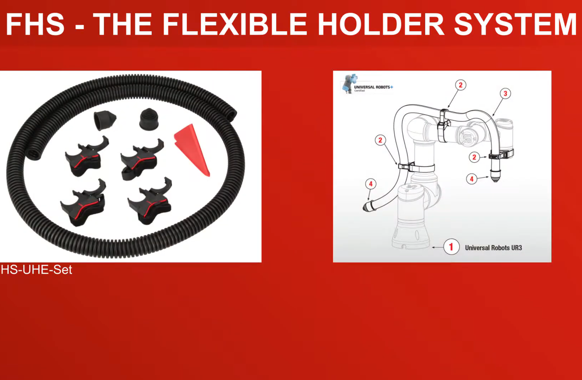Det Fleksible Holder System (FHS) anvendes til dress pack på UR-robotter. Det er designet til hurtig og værktøjsfri installation. Både grundlegemet af FHS og Velcro-tapen er fremstillet i en 2K-proces. Dette sikrer en sikker og skridsikker fastgørelse af medieudstyret samt en robotvenlig montering.